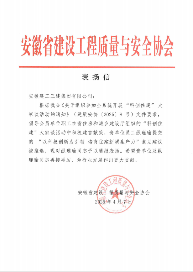 为响应协会号召,安徽建工三建集团积极建言献策,公司职工黄波提交的《关于发展智能建造和推广应用建筑机器人的建议》和纵瑾瑜提交的《浅谈“以科技创新为引领 培育住建新质生产力”》因前瞻性与实践价值突出,从众多建言中脱颖而出,获得协会高度认可。信中特别强调,两项建议为行业智能化转型和为传统建筑行业注入科技新活力提供了新思路,体现了企业职工在科技创新中的责任担当。近年来,公司通过搭建“产学研”平台,鼓励员工立足一线探索技术突破。此次建议被采纳,不仅展现了一线员工的智慧,更印证了集团“科技强企”战略的前瞻性。